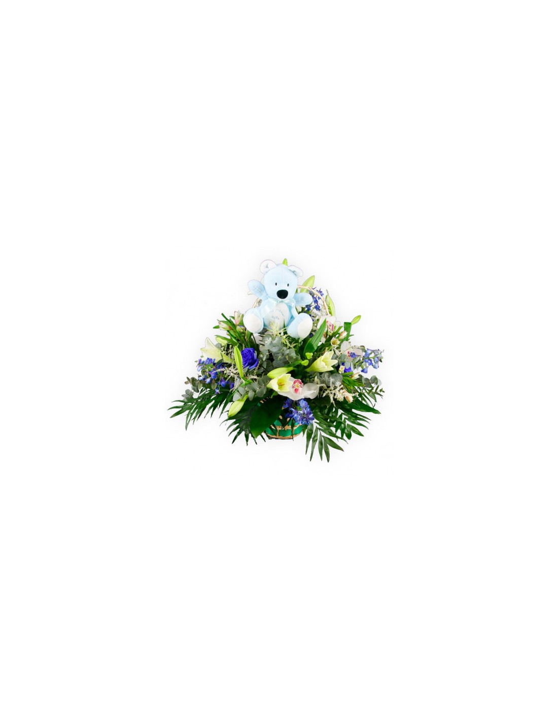 Ramo de flores variadas en tonos cálidos, compuesto por lilium, rosas, gerberas, margaritas, solídago e hyperium, ornamentado con verdes variados.