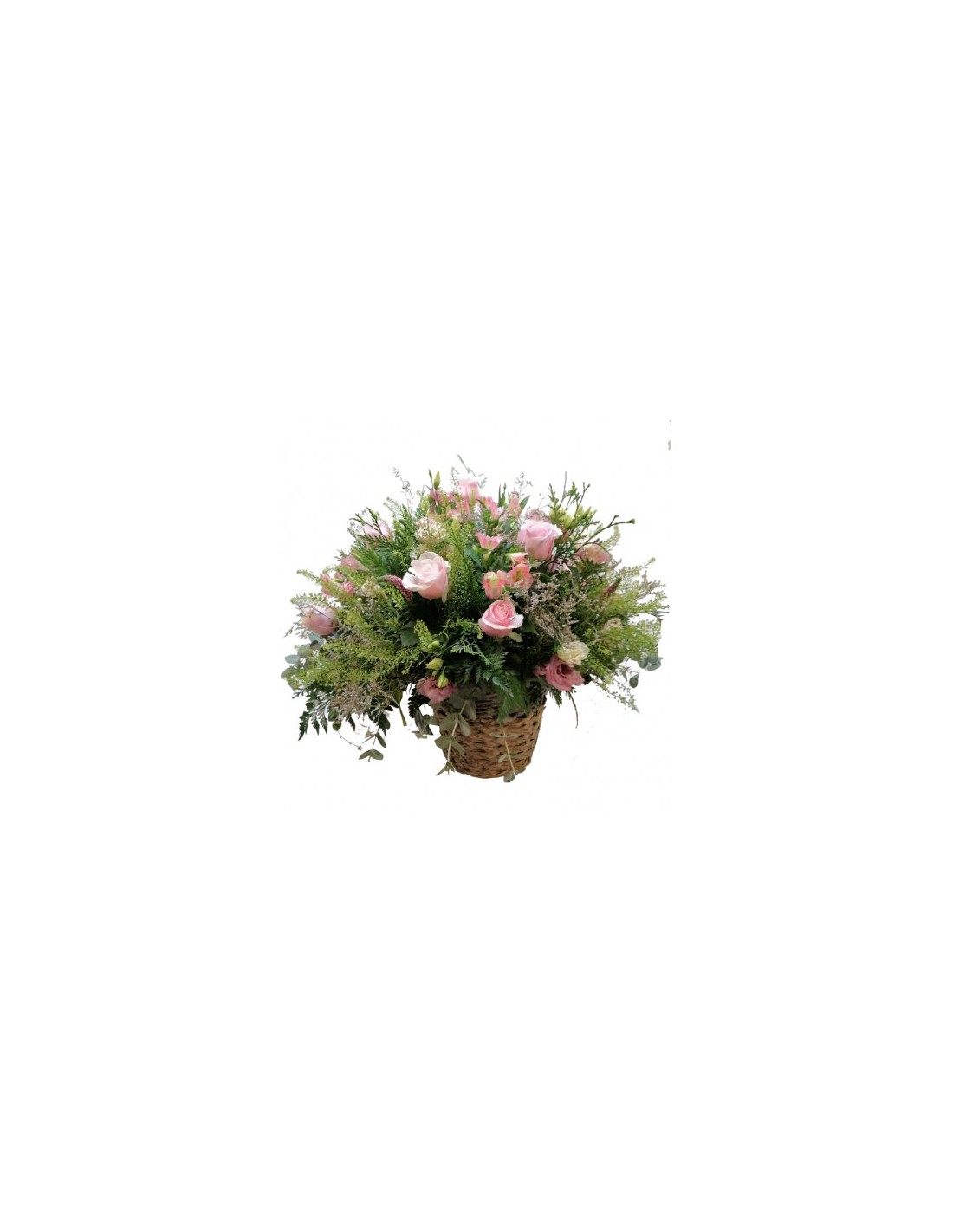 Original composición de gran impacto visual que incluye flores en tonos rosas y verdes, con flores tales como rosas, alstroemerias y diferentes verdes ornamentales.