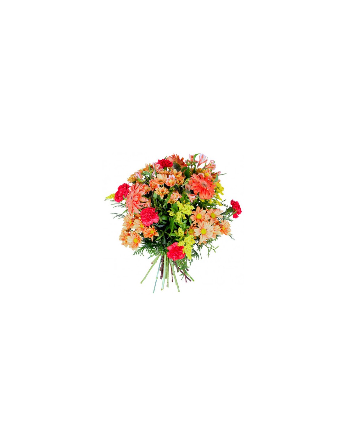 Ramo de flores variadas en tonos cálidos compuesto por margaritas, gerberas, alstroemeria, solidago y claveles.