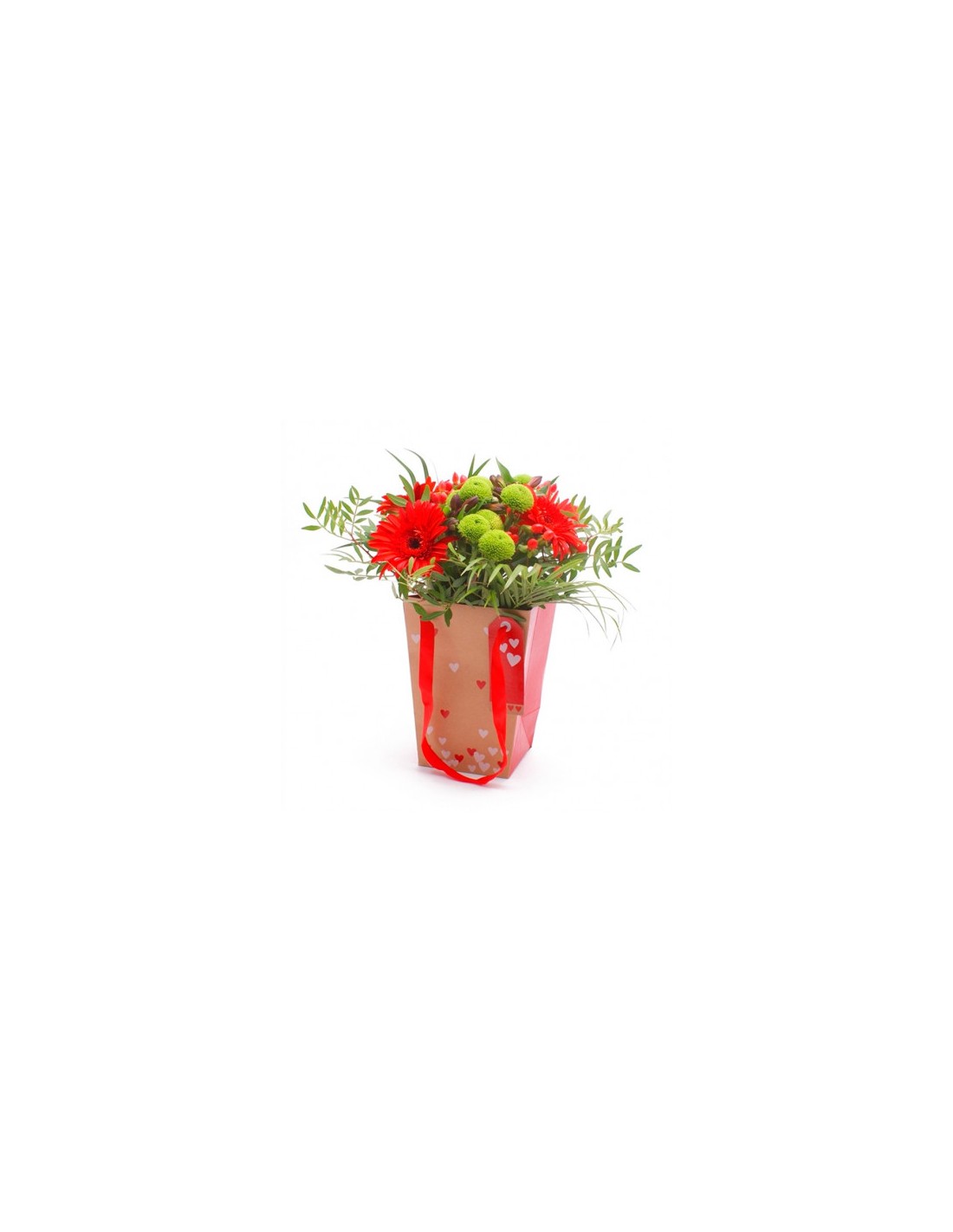 Precioso ramo silvestre con diferentes tipos de verdes, astromelias, gerberas rosas y ramas de salix.