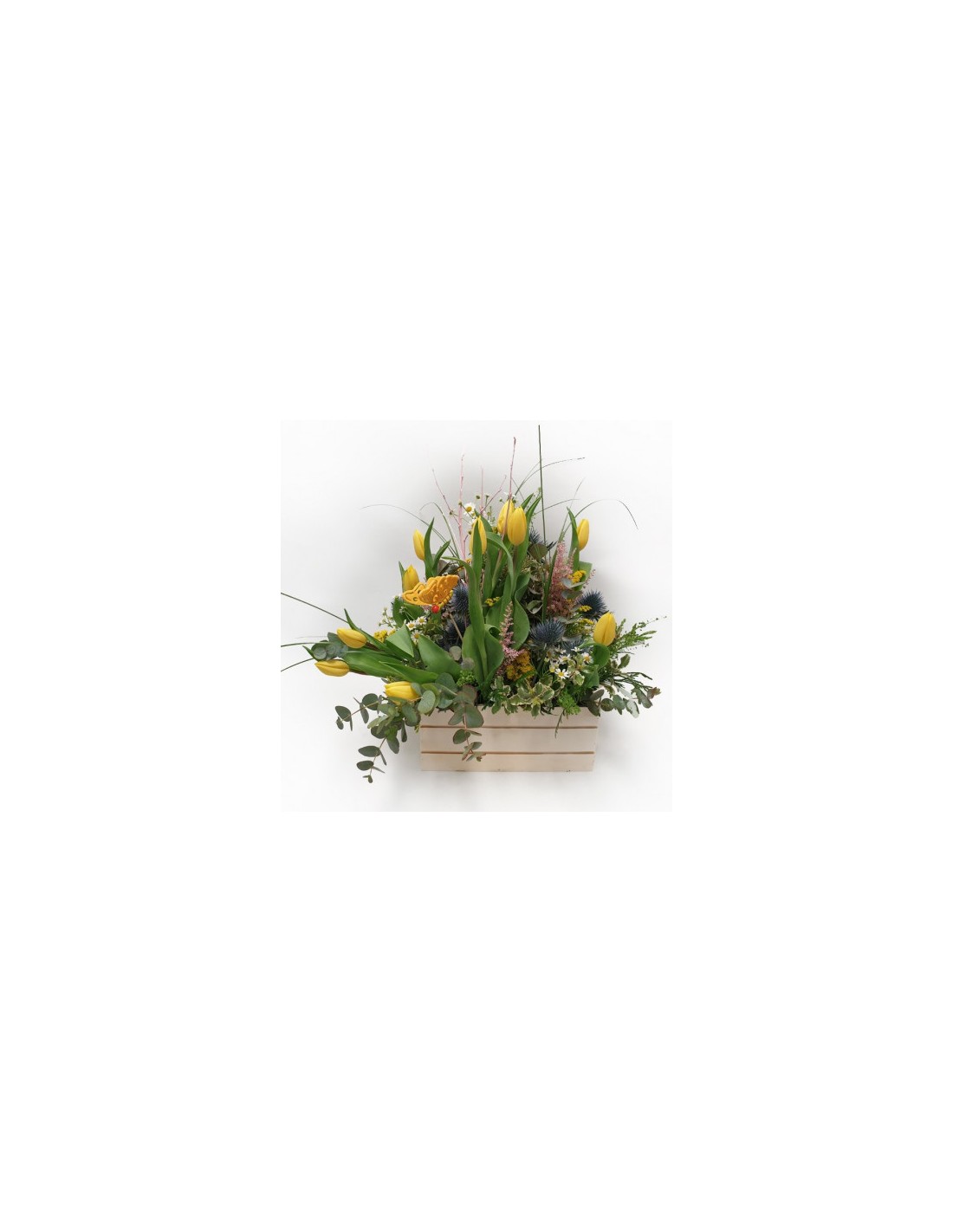 Espectacular cofre de rafia compuesto por una selección de diferentes flores en tonos blancos, rosas y azules. Acompañada por 3 pastillas de jabón Austin de aroma de rosas.