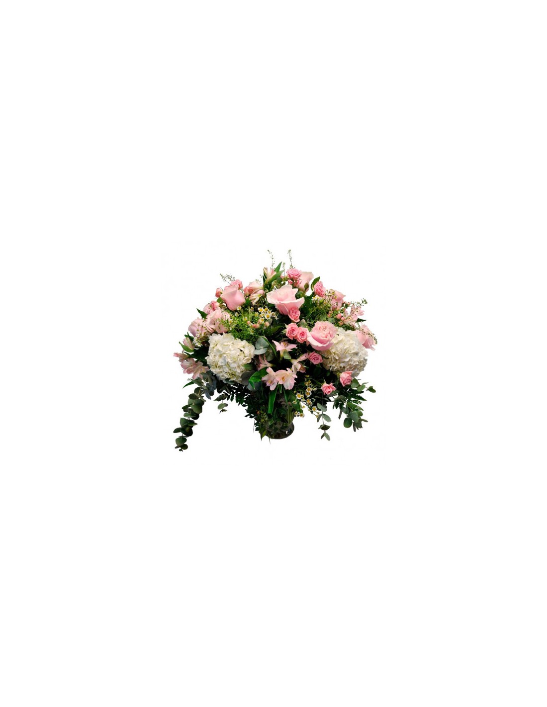 Elegante ramo de flores en tonos azules, rosas y blancos, compuesto por flores tales como hortensias, rosas, hypericum, astilbes, ornamentado con diferentes verdes y elementos secos como trigo