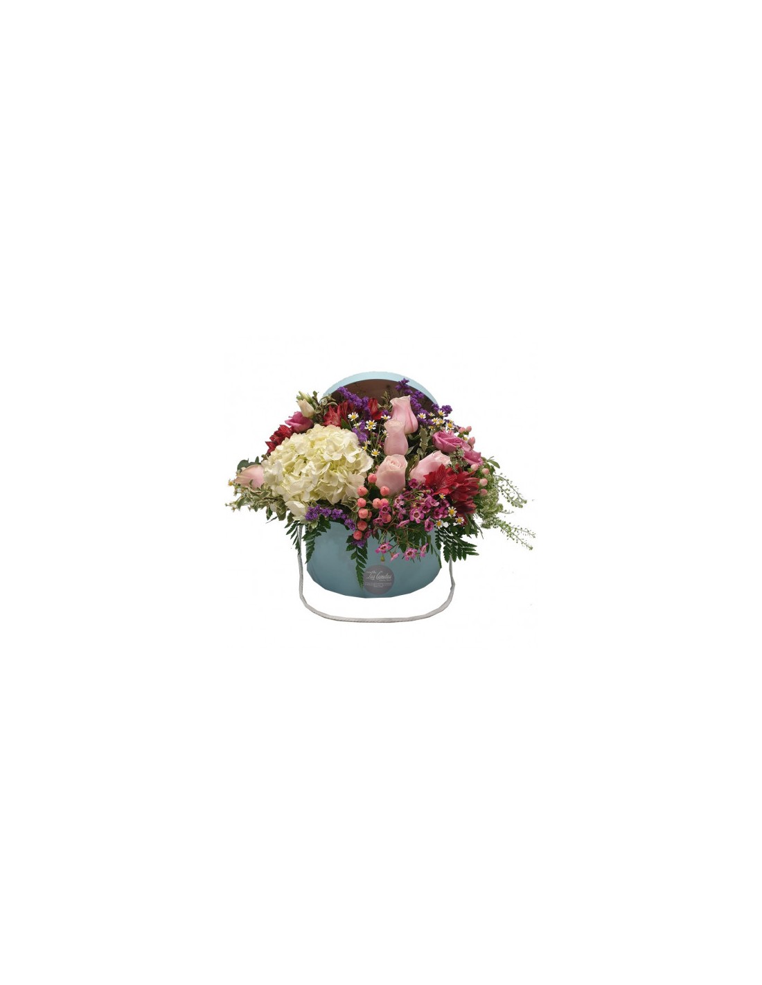 Original bolso de rafia acompañado por flores y verdes de estilo silvestre que evocan un paseo por el campo.